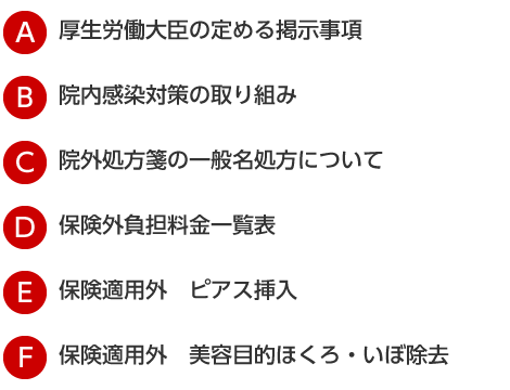A厚生労働大臣の定める掲示事項 B院内感染対策の取り組み C院外処方箋の一般名処方について D保険外負担料金一覧表 E保険適用外 ピアス挿入 F保険適用外 美容目的ほくろ・いぼ除去